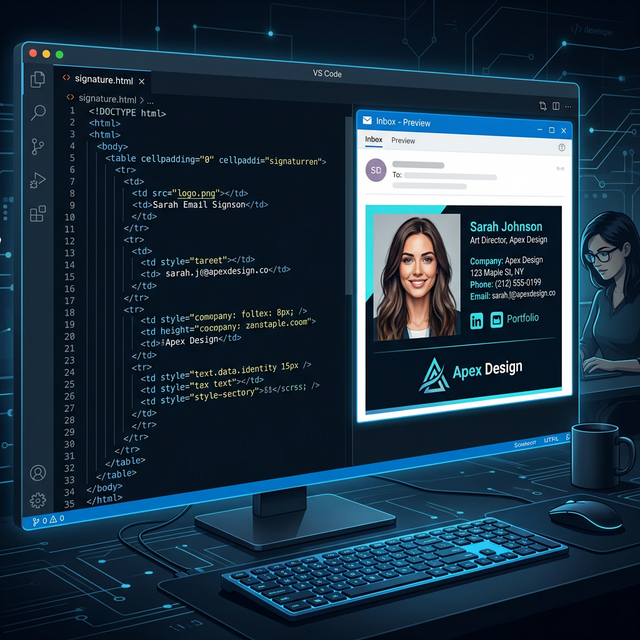 *Caption: A structured HTML signature utilizes a technical grid to keep brand elements aligned.*